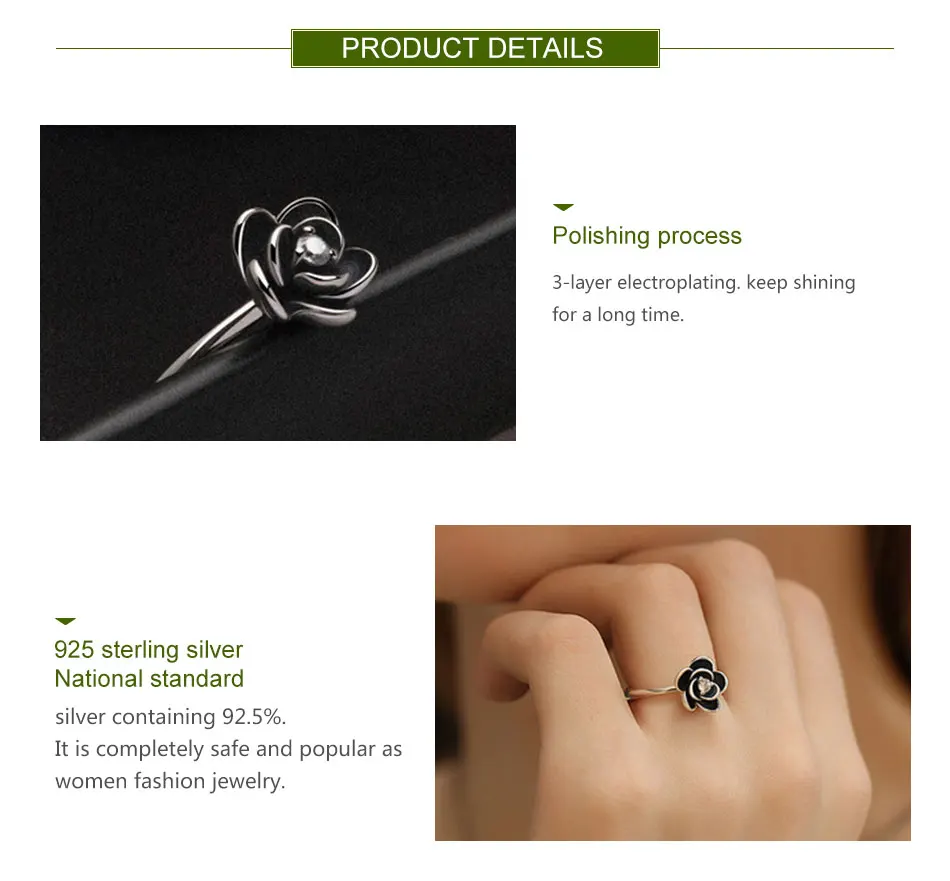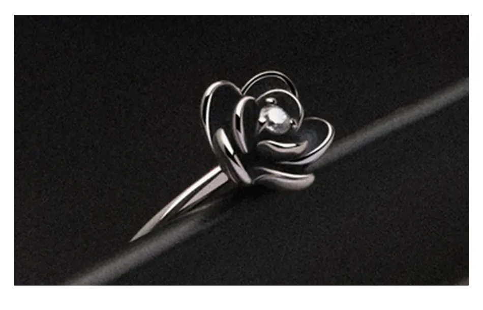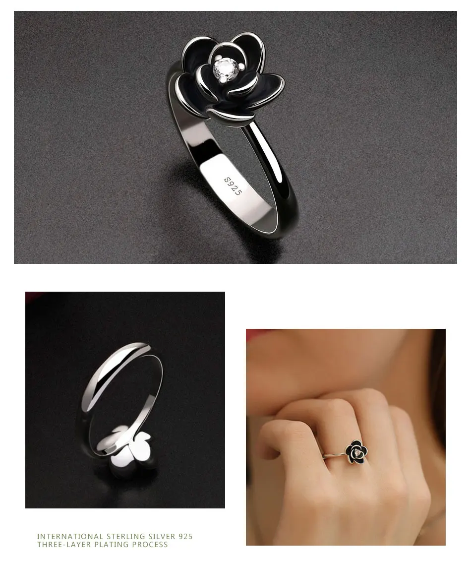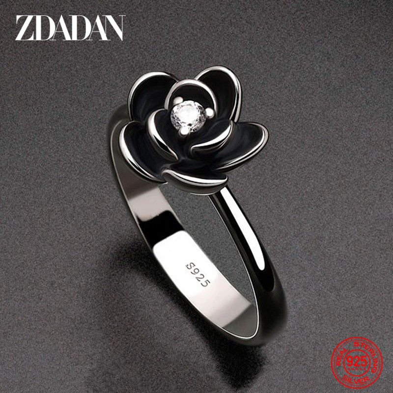 ZDADAN 925 Sterling Silver Charm Black Rose Flower Zircon Ring