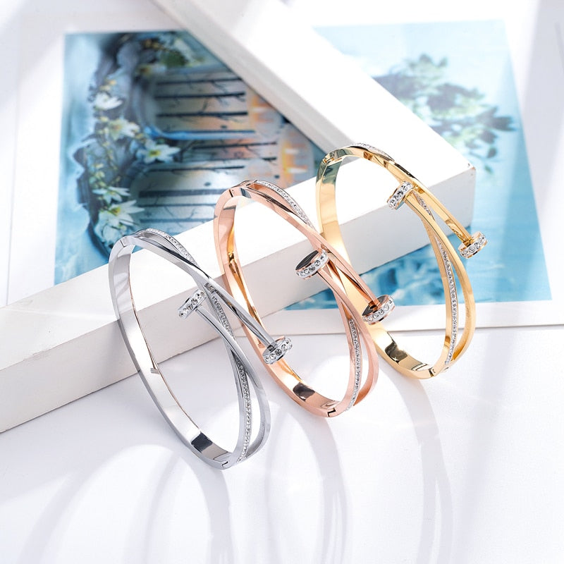 New Unique Double Crystal Nail Head Cross Stainless Steel Bracelet